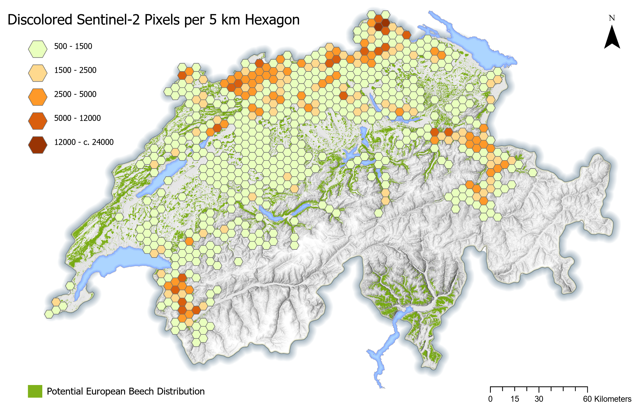 As global climate changes, extreme heat and drought are expected to become more frequent across central Europe. Such extreme conditions add to forest stress and affect long term forest health. The two most common tree species in Switzerland, Norway Spruce and European Beech, appear particularly susceptible to these climatic changes. The combination of high mid-summer temperatures and low precipitation in 2018 resulted in widespread forest canopy discoloration across Switzerland and much of central Europe over the following year. Within two years, Beech and Spruce stands that experienced discoloration, were associated with increased crown die-back and increased susceptibility to insect infestation as compared to areas that did not experience discoloration resulting from the summer 2018 conditions.