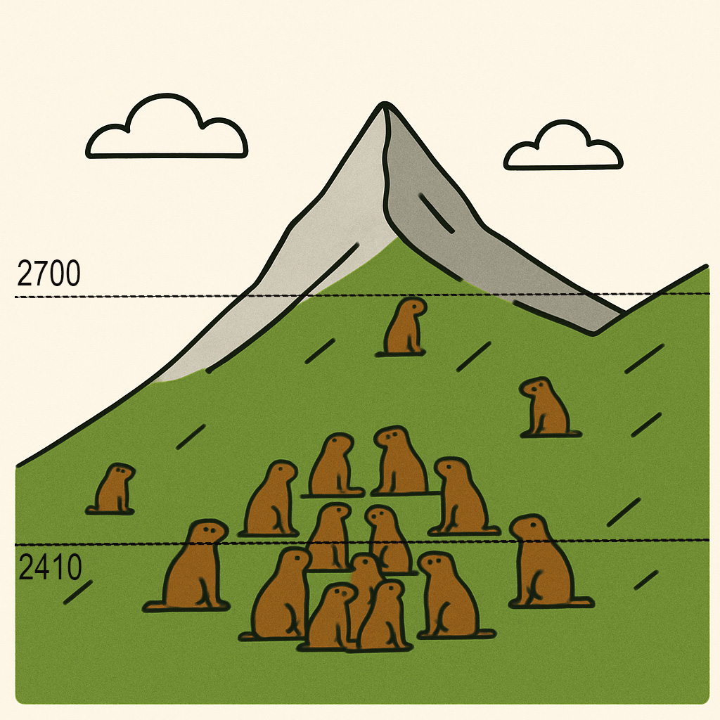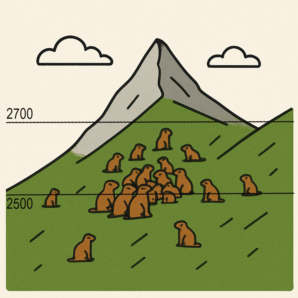 • Marmots in the Dischma-valley now live at altitudes on average 86 metres higher than in 1982 but remain below the known upper limit of 2,700 metres. Climate change alone only partially explains this shift.